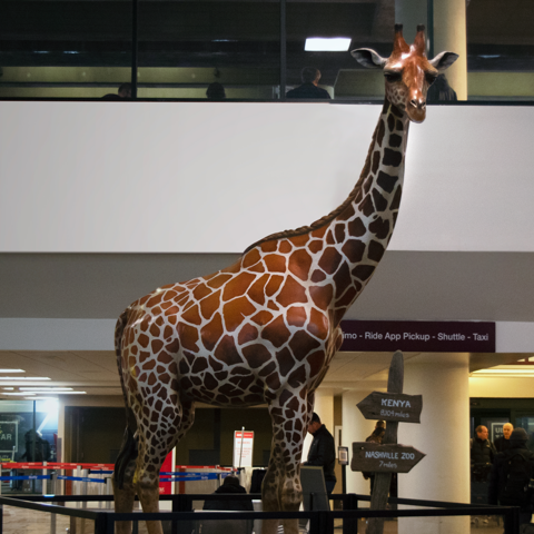 Nashville Zoo installed the giraffe, created by Dorand Design Studios, overnight on January 9 in hopes to draw more attention to the Zoo. The giraffe is accompanied by a few pieces of luggage and signs directing toward Nashville Zoo (7 miles away) and Kenya (8,104 miles away).