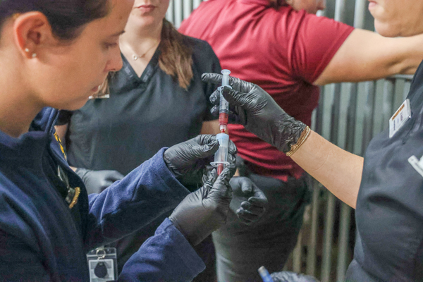 Nashville Zoo Veterinary Team transfers blood to a collection tube.