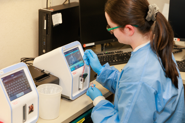 Lab tech loading blood sample into TEG machine at Tristar Skyline Medical Center.