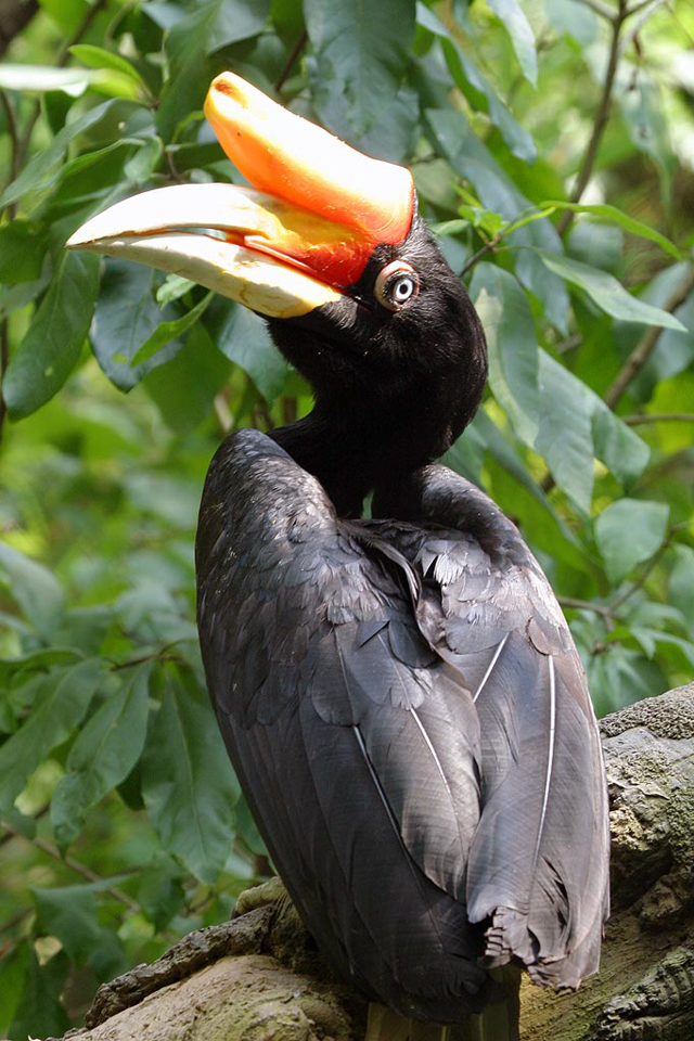The Rhinoceros Hornbill is one of 54 species of hornbills that exist. It can be distinguished by its banana-shaped casque on the top of its beak. The casque is made out of keratin, like our fingernails, and is very strong and lightweight.