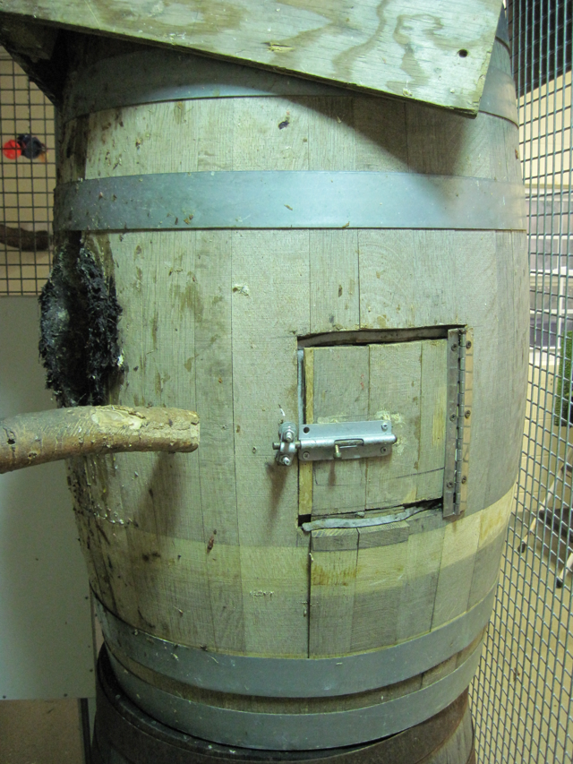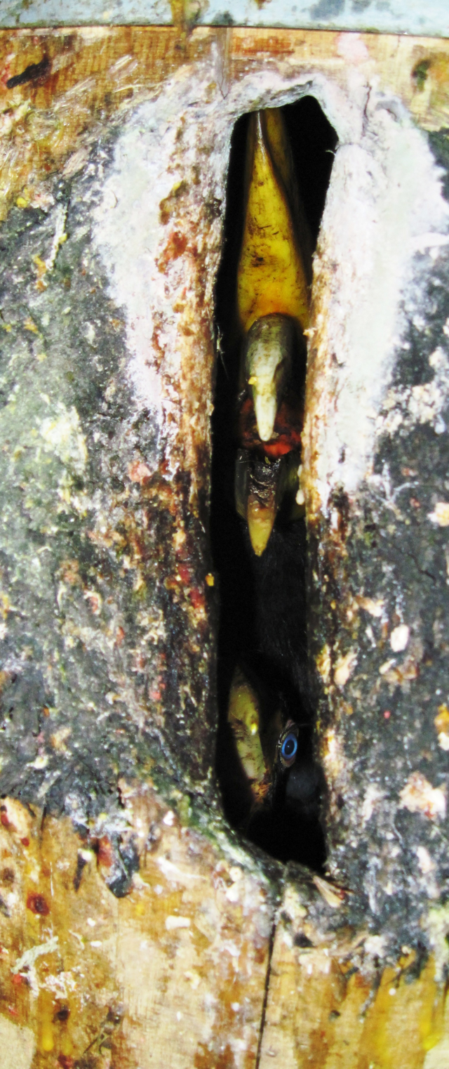 In the Zoo, hornbill breeding is encouraged by offering a large wooden barrel on a raised platform to simulate a hollow tree trunk. The barrel is modified with a small access door and a mounted infrared camera so that keepers can determine when eggs are laid and for monitoring the growth of the healthy chicks.