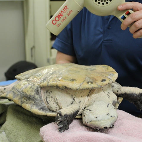 It’s not often that one gets the opportunity to observe a turtle spa day. Dr. Heather Robertson, DVM and her veterinarian team were kind enough to invite us to observe a behind-the-scenes shell treatment on one of the Zoo’s resident Spot-bellied Side-necked Turtles (Phrynops hilarii), Mrs. Beasley. This isn’t your average turtle shell procedure – in this specific case, it’s known as Mrs. Beasley’s spa day.