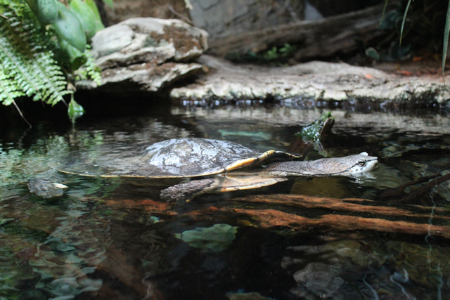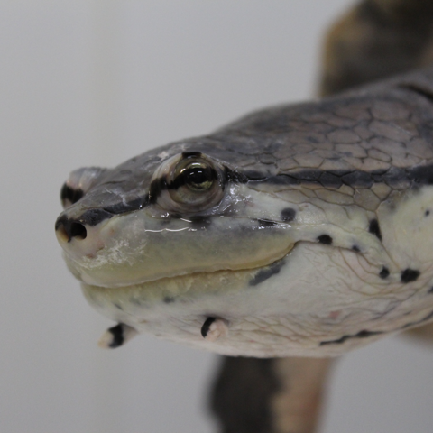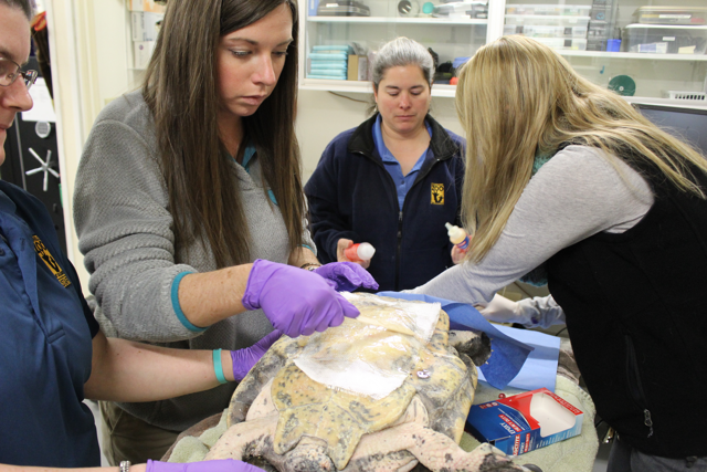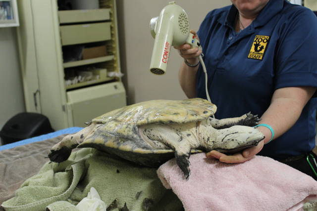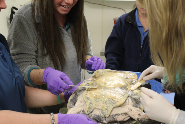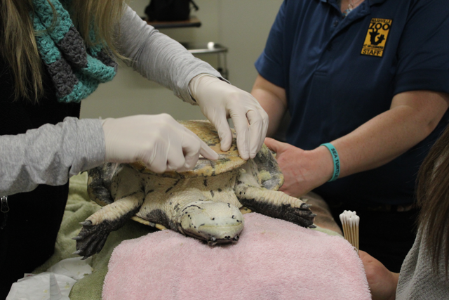 Mrs. Beasley has been a part of the Zoo’s animal collection since Unseen New World first opened in 1998. Due to long-term damage to her lower shell that occurred before she arrived at the Zoo, Mrs. Beasley needs to have a protective epoxy and fiberglass patch covering (the same materials used to patch the bottom of a boat) on her plastron (lower shell). Her shell has cracks and deep divots to the bottom portion of her shell leaving open wounds prone to infection. Because this damage is chronic and most of her time is spent in water, it’s necessary for Mrs. Beasley to undergo preventative shell treatments to protect her from infections.