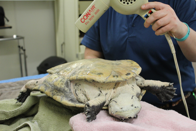 Mrs. Beasley is one of Dr. Robertson’s best patients and seems to really enjoy the extra attention. She watches everyone in the procedure room as they move about and listens to vet staff conversations. Because of Mrs. Beasley’s great behavior and easiness to work with, her semiannual shell procedure has been renamed “Mrs. B’s Spa Day.”