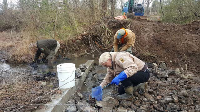 The team captured and relocated a total of 33 crayfish and 34 other aquatic critters, including salamanders, frogs and darters, to ensure the safety of the animals inhabiting the area around the dams. Native trees, shrubs, and two foot pieces of tree that will root and grow into trees and help to stabilize the soil will also be planted along the stream banks of the disturbed area.