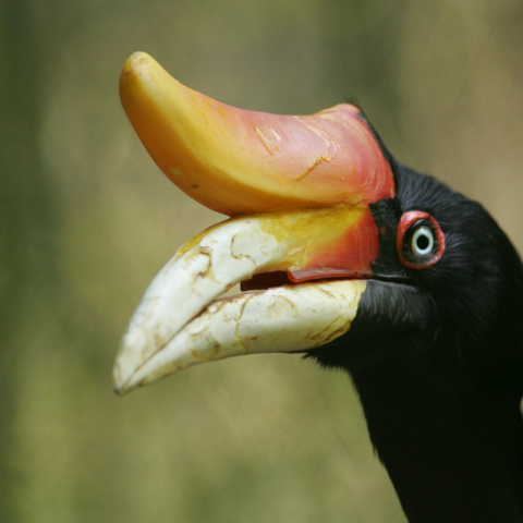 The rhinoceros hornbill is classified as “Near Threatened” by the IUCN and faces many challenges in the wild. Along with the global issue of deforestation resulting in a loss of habitat, these birds are hunted as food, and ornaments are made out of their casques and feathers. While the species is not yet considered endangered, it has been decreasing in number.