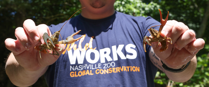 Our Aquatics team received a grant from U.S. Fish and Wildlife Service in 2011 to develop protocols and implement long-term population monitoring for the federally endangered Nashville crayfish. The Nashville crayfish (Faxonius shoupi) is the only animal whose entire range is located only in the greater Nashville area, as it is only found in Mill Creek and its tributaries (this includes the stream that flows through Nashville Zoo, although they aren’t found in this part of the stream). Nashville crayfish are considered endangered by the International Union for the Conservation of Nature due to development, pollution and agricultural run-off.
