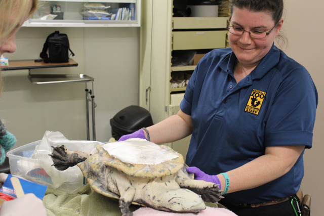 Mrs. Beasley has been a part of the Zoo’s animal collection since Unseen New World first opened in 1998. Due to long-term damage to her lower shell that occurred before she arrived at the Zoo, Mrs. Beasley needs to have a protective epoxy and fiberglass patch covering (the same materials used to patch the bottom of a boat) on her plastron (lower shell). Her shell has cracks and deep divots to the bottom portion of her shell leaving open wounds prone to infection. Because this damage is chronic and most of her time is spent in water, it’s necessary for Mrs. Beasley to undergo preventative shell treatments to protect her from infections.
