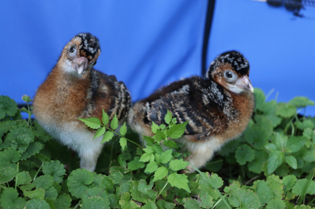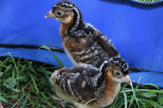 The chicks, weak and damp at first, were fluffy and walking within 24 hours. The second and third chicks, which hatched two days apart, are now growing up together. Their older brother, born in the beginning of June, is starting to get his adult plumage and is growing up with his chicken “brother.”
