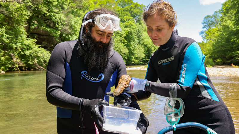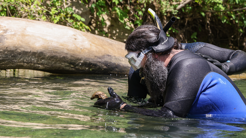 Hellbender conservation team in waterway preparing to release salamander