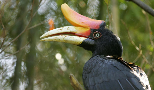 The rhinoceros hornbill (Buceros rhinoceros) is one of 54 species of hornbills that exist. It can be distinguished by its banana-shaped casque on the top of its beak. The casque is made out of keratin, like our fingernails, and is very strong and lightweight. The hornbill can live up to 35 years and can be found in Southeast Asia.